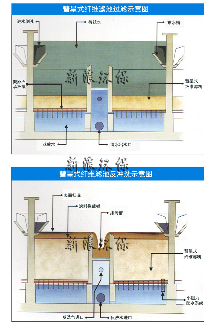 彗星式纖維濾池是一種重力式深層過濾池,它采用彗星式纖維濾料,小阻力配水布,氣水反沖,變水位或恒水位過濾方式,是目前深層過濾池中去除懸浮物較的過濾技術(shù)。