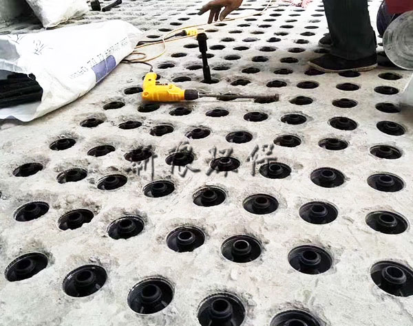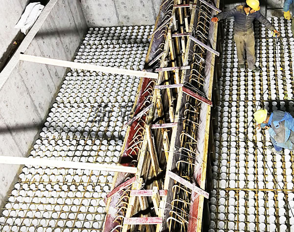 這是因?yàn)檎w澆筑ABS濾板立體綁扎鋼筋和池壁的預(yù)埋鋼筋左右能成網(wǎng)狀結(jié)構(gòu)和濾梁的預(yù)埋鋼筋上下形成立體結(jié)構(gòu),極大的提高了濾板整體荷載力和抗沖擊力。這是小塊預(yù)制濾板的預(yù)埋螺栓無法實(shí)現(xiàn)的。在曝氣生物濾池中濾料層的填充高度往往高達(dá)4m,因此荷載要高于給水中的濾池。
